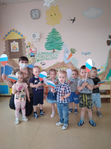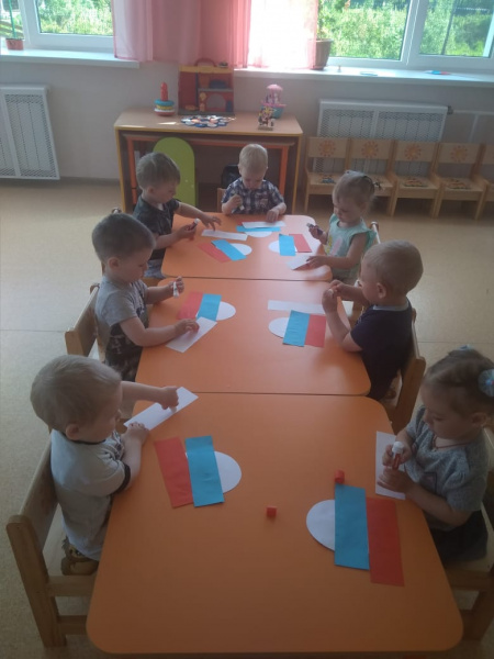 В нашем детском саду накануне празднования Дня Независимости России проходят мероприятия. Так, с воспитанниками первой группы раннего возраста «Солнышко» была проведена беседа на тему «Наша Родина – Россия», в ходе которой дети познакомились с понятиями «Родина», «Флаг», «Герб», сделали пальчиковую гимнастику «Мы жители России». Затем внимательно рассмотрели российский флаг и выполнили аппликацию «Российский воздушный шарик». Такое занятие для детей имело особенное значение — ребенок вкладывал свое умение и старание в работу с бумагой, клеем. В процессе этого занятия у ребенка развивается не только чувство патриотизма и преданности своей Родине, но и чувство прекрасного.