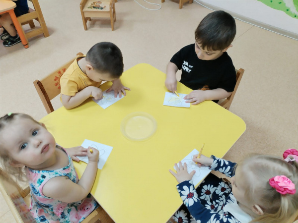 После сказки детям было предложено самим раскрасить значки жёлтым цветом, чтобы тоже подарить Гоше и его другу.