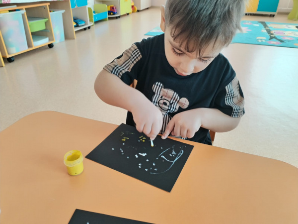 Ребята второй группы раннего возраста «Солнышко» провели занятие – экскурсию: «Дорога в космос», на котором детям рассказали о первом человеке, отправившемся покорять космическое пространство — Юрии Гагарине, о собаках Белке и Стрелке, которым удалось до человека побывать в космосе. Воспитатель, Быкова Н. А. используя нетрадиционную технику рисования, научила ребят рисовать косметическими палочками звезды. В творческой деятельности дети проявили свою фантазию. Выполнили аппликацию с использованием пластина «Космические ракеты», и в завершении дня с большим удовольствием построили ракеты из кубиков.