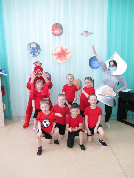 В празднично украшенном музыкально-спортивном зале старшие группы собрались на праздник «Полет в космос». Для наших ребят на это оказалось интересным и возможным. Именно в этот праздничный день девчонки и мальчишки готовились стать настоящими космонавтами. Центром подготовки к полётам руководила Жмыхова К.А., музыкальный руководитель. Вместе с инопланетными гостями Марсианином и Сатуренком дети отправились покорять просторы вселенной . Ребята строили ракету, спасали свой космический борт от падающих метеоритов, изучали лунный грунт, даже отведали настоящий завтрак космонавта. Праздник сопровождался веселыми музыкальными играми и танцами.
