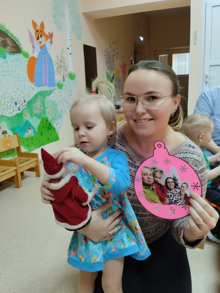 Ребятам очень понравилось играть с Дедом Морозом, и они с нетерпением ждут следующей встречи уже на новогодней ёлке. А семейная ёлочка стала главным украшением группы. Ребята теперь каждый день любуются фотографиями своих родных и близких.