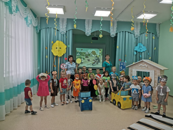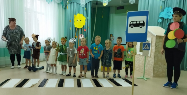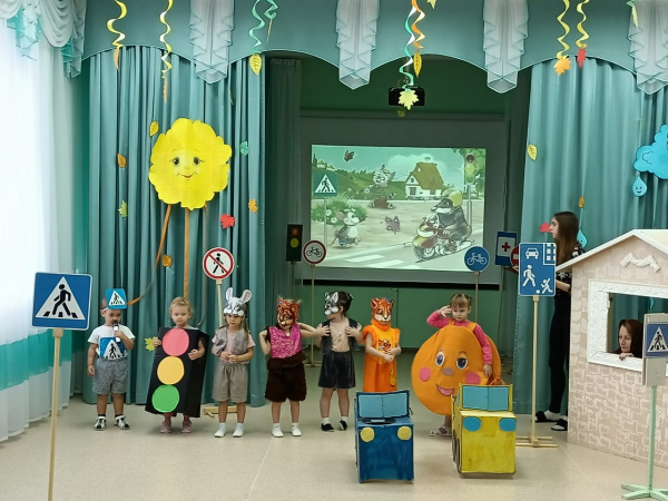 Воспитанники группы «Улыбка» представили спектакль «Колобок и дорога», где все герои рассказывали правила поведения на дороге и важность соблюдения ПДД.