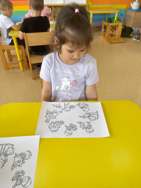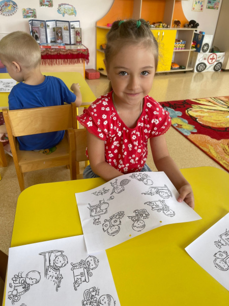 После каждому воспитаннику были даны картинки с режимом дня в черно белом варианте, ребята их рассмотрели и раскрасили.