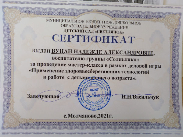 Сертификат за проведение мастер-класса «Применение здоровьесберегающих технологий с детьми раннего возраста»,МБДОУ д/с «Светлячок», 2021г.(смотреть)