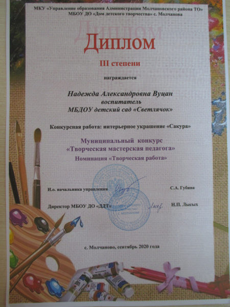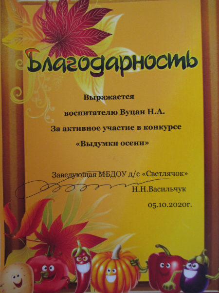 Благодарность за активное участие в осеннем конкурсе МБДОУ д/с «Светлячок», 2020г. (смотреть)