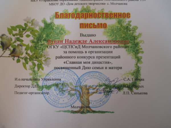 Благодарственное письмо «ДДТ» с.Молчаново, 2019г.(смотреть)
