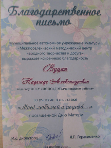 Благодарственное письмо МУК «Межпоселенческий методический центр народного творчества и досуга», 2019г.(смотреть)
