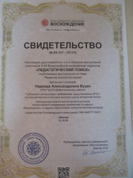 Всероссий ский конкурс, «Центр гражданского образования», предоставления опыта работы на тему: «Развитие мелкой моторики», 2019г.(смотреть)