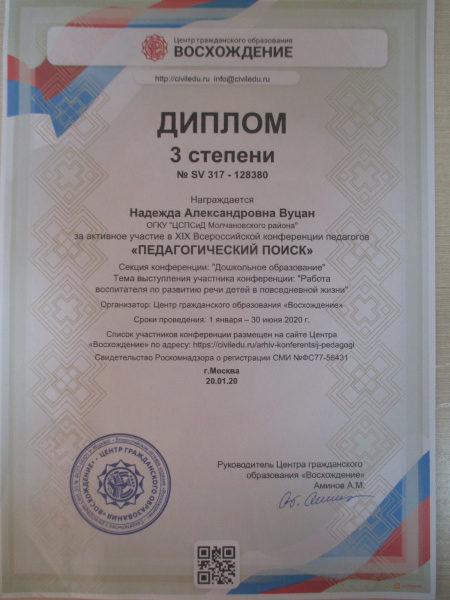 Всероссийский конкурс, Диплом 3 степени «Центр гражданского образования», выступление на тему: «Работа воспитателя по развитию речи детей в повседневной жизни», 2020г. (смотреть)