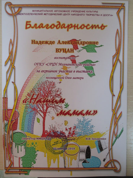 Благодарственное письмо МУК «Межпоселенческий методический центр народного творчества и досуга», 2018г.(смотреть)
