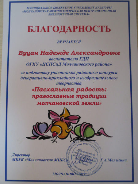 Благодарность МУК «Молчановская межпоселенческая централизованная библиотечная система», 2019г.(смотреть)