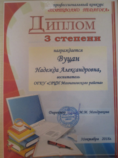 Диплом 3 степени, ОГКУ «СРЦН Молчановского района», 2018г.(смотреть)