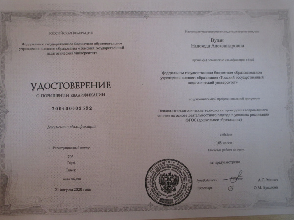 ТГПУ, Удостоверение о повышении квалификации по теме: «Психолого-педагогические технологии проведения современного занятия на основе деятельностного подхода в условиях реализации ФГОС (дошкольное образование).», 108ч,21.08.2020г. (удостоверение)