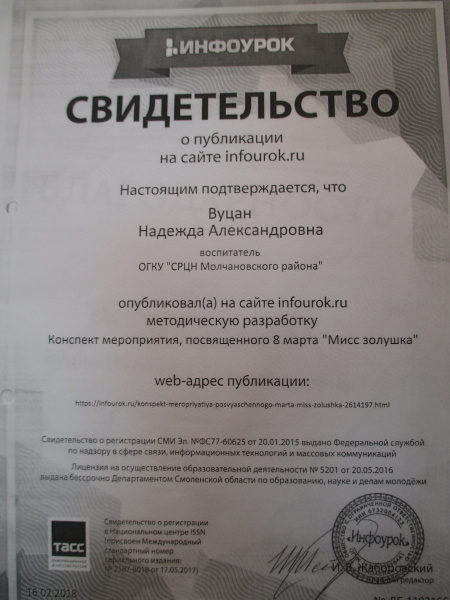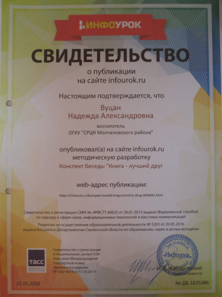 Свидетельство о публикации на сайте infourok.ru, 2018г.(смотреть)