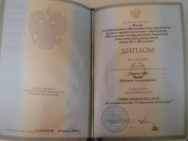 Образование: Высшее, «Московский Государственный Открытый Педагогический Университет имени М.А.Шолохова», 2006г.Специальность: «социальная педагогика»  Диплом об образовании