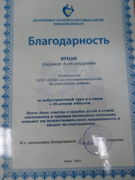 Благодарность департамента по вопросам семьи и детей Томской области, 2012 г.(смотреть)