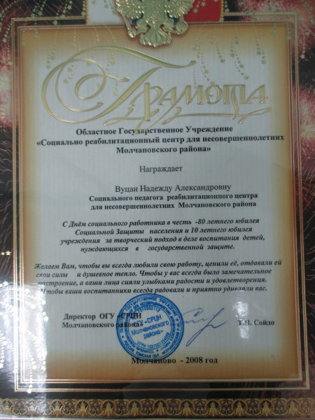 Грамота ОГКУ «СРЦН Молчановского района», 2008 г.(смотреть)