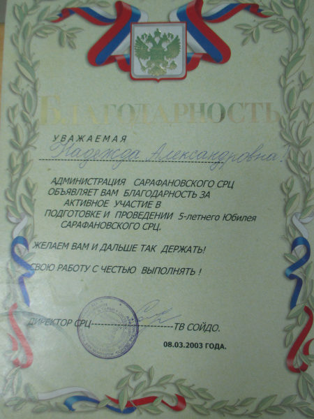 Благодарность администрации Сарафановского СРЦ, 08.03.2003 г.(смотреть)