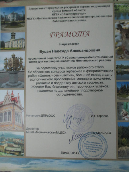 Грамота департамента природных ресурсов и охраны окружающей среды Томской области, 2014 г.(смотреть)