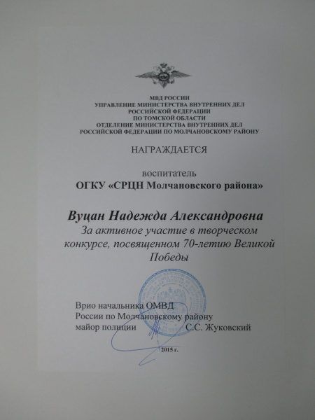 Грамота МВД России управление министерства внутренних дел Российской федерации отделение министерства внутренних дел Российской федерации по Молчановскому району, 2015 г.(смотреть)