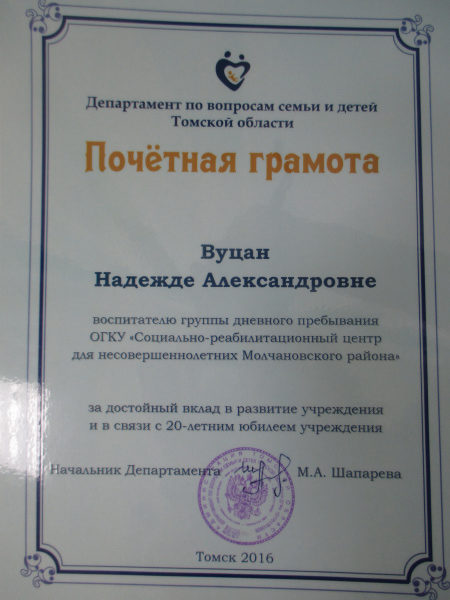Почётная грамота департамента по вопросам семьи и детей Томской области, 2016 г.(смотреть)