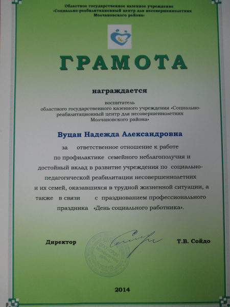 Грамота ОГКУ «СРЦН Молчановского района», 2014 г.(смотреть)
