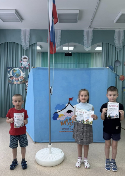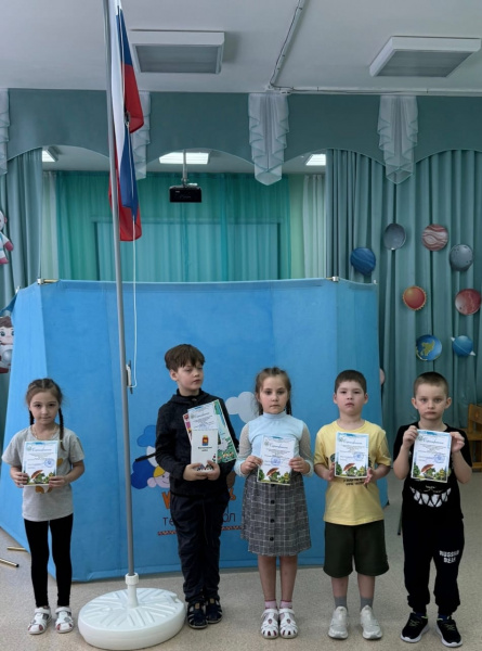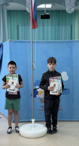 Сегодня, 14 апреля, флаг РФ доверено было поднять воспитанникам старше — подготовительной группы, Кузьминых Георгию занявшего I место и Леонтьеву Матвею, занявшему III  место в районном творческом конкурсе по охране труда «Я рисую безопасный труд — 2025».