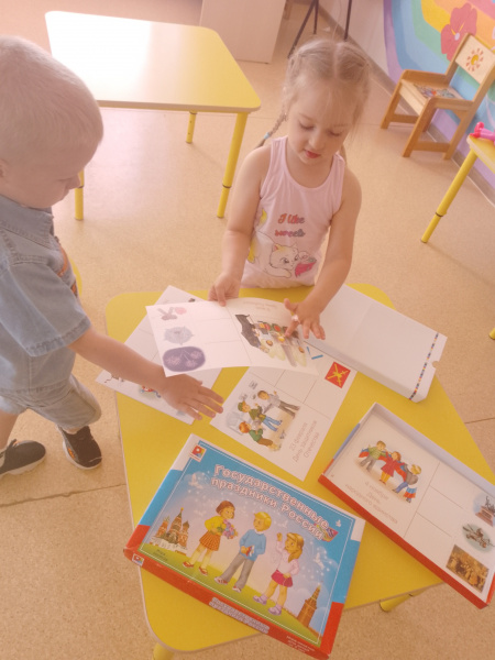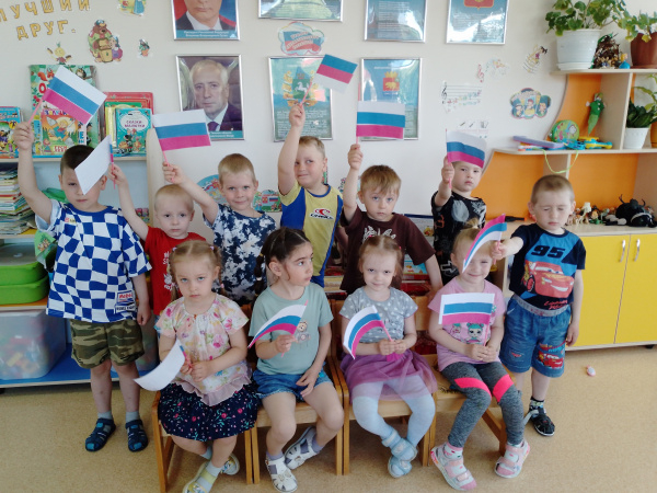 В течение недели с детьми группы «Радуга» были проведены мероприятия, посвящённые этому событию, направленные на формирование у детей представлений о родной стране, воспитании чувства любви к родному краю. С детьми беседовали на темы «Мой дом – моя страна», «Россия – родина моя», «С кем ты живешь?», рассмотрели символы страны: флаг, герб и гимн РФ. Была выполнена аппликация «Российский флаг», играли в дидактическую игру «Собери солнышко лучистое», читали художественную литературу.